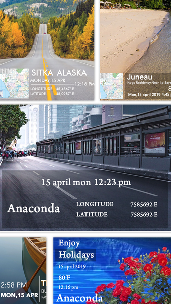 يوفر هذا التطبيق تفاصيل مثل الموقع على الخريطة، وعنوان الموقع، والوقت والتاريخ، وخط العرض وخط الطول، وتفاصيل الطقس ودرجة الحرارة. يمكنك التقاط الصور المباشرة مع إضافة هذه التفاصيل إلى الجزء السفلي من الصورة. بالإضافة إلى ذلك، هناك فئات قوالب متنوعة للاختيار من بينها، بما في ذلك GPS والسفر والأفقي والعمودي والشتاء والصيف والموسم المطير وغيرها.
